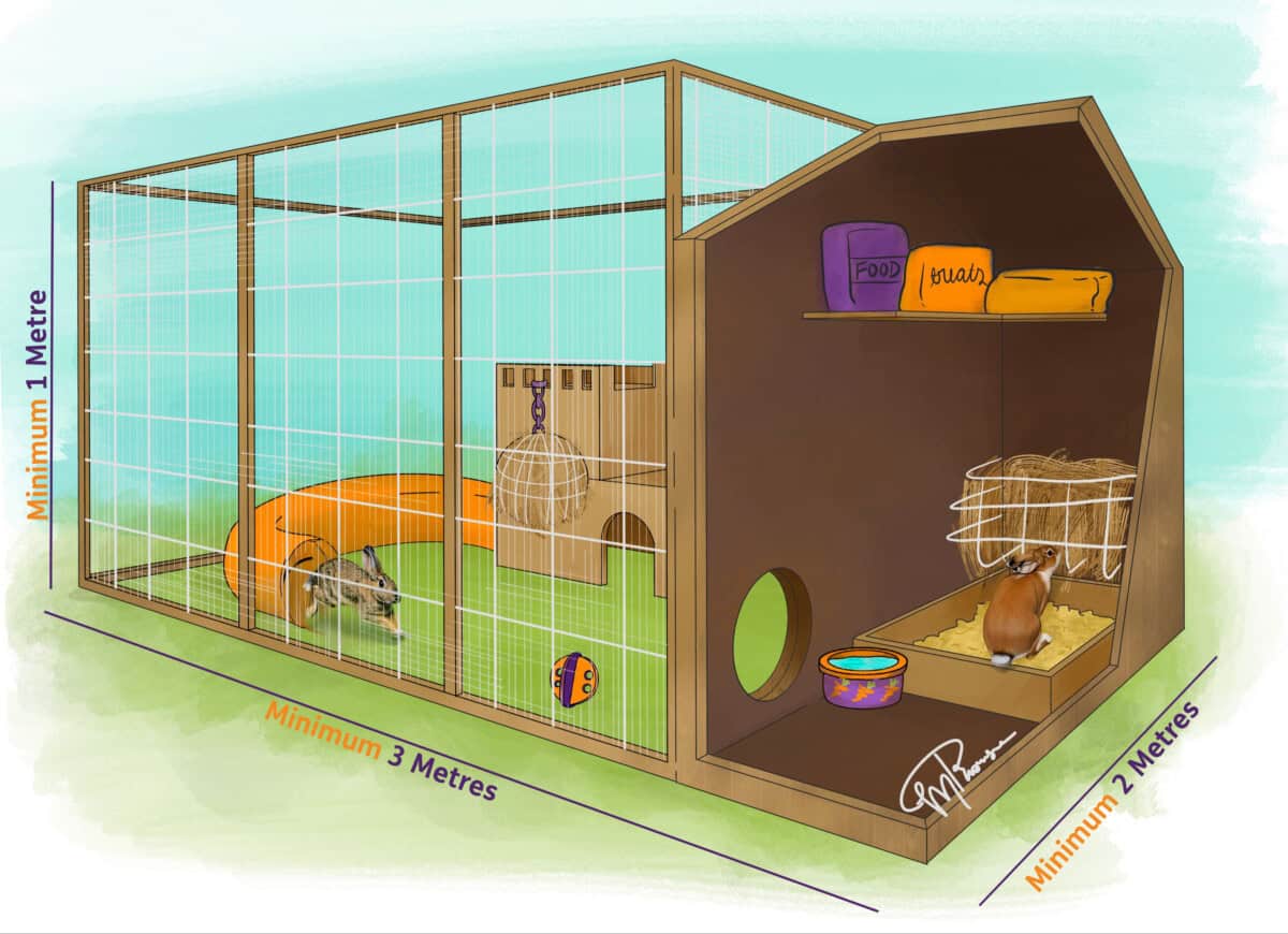 For outdoor rabbits, a sheltered space is required within the environment. This space should be a minimum of 6ft (183cm) x 2ft (61cm) x 2ft(61cm).